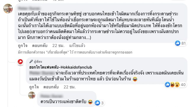 ร้านอื่นก็น่าจะเจอแบบเดียวกันเลยคิดว่าน่าจะดีถ้าเราช่วยกันประชาสัมพันธ์ คนฮอกไกโดจะได้รักนนท. ไทยมากขึ้น และน่าจะมีประโยชน์กับเมืองอื่นๆด้วย เผื่อคนที่เพิ่งเคยมาญี่ปุ่นครั้งแรกจะได้ทราบด้วย ส่วนใหญ่น่าจะเจอปัญหานี้ในห้องน้ำหญิง เพราะในห้องน้ำจะมีแค่ถังขยะใบเล็กๆเอาไว้ทิ้งผ้าอนามัยเท่านั้นบางทีคือเล็กแบบเล็กมากจริงๆ ถ้านนท.ไทยเอาทิชชูไปทิ้งในนั้นหมด ไม่ถึง10 คนก้อน่าจะเต็มแล้วพนักงานญี่ปุ่นเค้าอาจจะกลุ้มใจไม่รู้จะบอกยังไงเหมือนกัน ยังไงฝากพี่แอดมินสะมุโตะ ประชาสัมพันธ์ด้วยนะคะ ขอบคุณค่ะ… จบ…. จดหมายจากแฟนเพจ