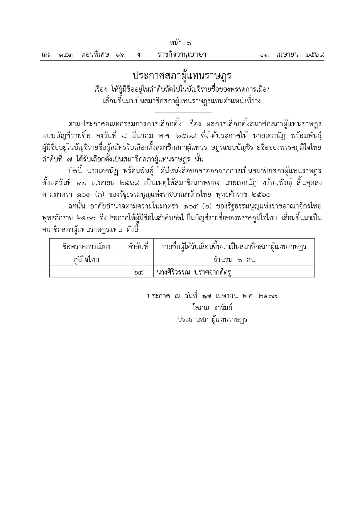 ฉะนั้น อาศัยอำนาจตามความในมาตรา 105 (2) ของรัฐธรรมนูญแห่งราชอาณาจักรไทยพุทธศักราช 2560 จึงประกาศให้ผู้มีชื่อในลำดับถัดไปในบัญชีรายชื่อของพรรคภูมิใจไทย เลื่อนขึ้นมาเป็นสมาชิกผู้แทนราษฎรแทน คือ ลำดับที่ 24 นางศิริวรรณ ปราศจากศัตรู