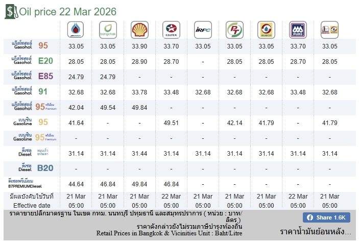 อ่านข่าวต้นฉบับได้ที่ : ราคาน้ำมันวันนี้ 22 มี.ค.69 ปั๊มไหนราคาเท่าไหร่บ้าง 5 สถานีบริการน้ำมัน
