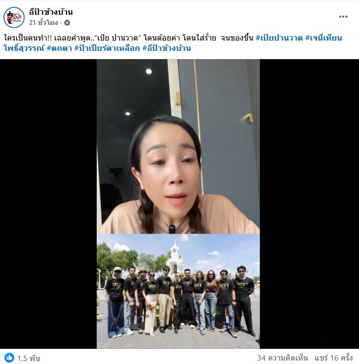 เรื่องราว เป้ย ปานวาด เดือดประกาศถอนตัวจากซีรีส์ ตถตา I AM WHAT I AM ล่าสุดเพจ อีป้าข้างบ้าน โดย ป้าเปียร์ โพสต์คลิปไปสืบเรื่องนี้มาแล้ว แคปชั่นว่า “ใครเป็นคนทำ!! เฉลยคำพูด..“เป้ย ปานวาด” โดนด้อยค่า โดนใส่ร้าย จนของขึ้น #เป้ยปานวาด #เจนี่เทียนโพธิ์สุวรรณ์ #ตถตา #ป้าเปียร์ตาเหลือก #อีป้าข้างบ้าน”