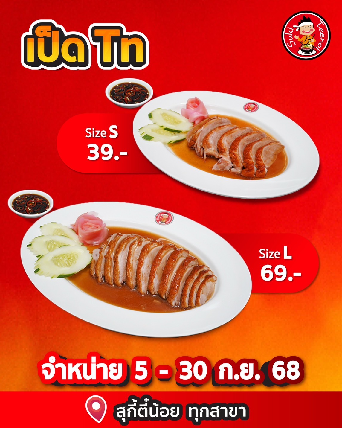 สุกี้ตี๋น้อย พร้อมเสิร์ฟเป็ดย่าง ขาย 39-69 บาท เริ่ม 5-30 ก.ย. 68