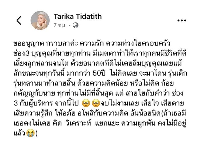 จากกรณีที่ แม่ก้อย ทาริกา ธิดาทิตย์ ผู้จัดละครและนักแสดงรุ่นใหญ่ ได้โพสต์ข้อความผ่านโซเชียลมีเดียในเชิงน้อยใจและตัดพ้อถึงความสัมพันธ์กับช่อง 3 ที่อยู่มานานกว่า 50 ปี จนกลายเป็นประเด็นที่หลายคนให้ความสนใจและส่งกำลังใจให้เธออย่างล้นหลาม