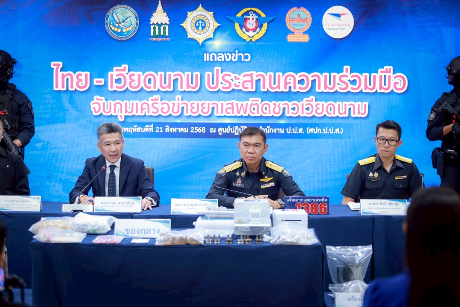 วันที่ 21 ส.ค.68 ที่คอนโดมีเนียมย่านรามคำแหง ต่อเนื่องบ้านเช่าย่านลาดพร้าว กทม. พล.ต.ท.ภาณุรัตน์ หลักบุญ เลขาธิการ ป.ป.ส. พร้อมด้วย นายปฤณ เมฆานันท์ ผู้อำนวยการสำนักปราบปรามยาเสพติด สำนักงาน ป.ป.ส., พ.อ.ฤทธิรงค์ ตุ้มทอง (หน.หน่วยปฏิบัติการข่าวสนับสนุน ทภ.1 สน.322 สปก.ฝขว.ศปก.ทบ.), นายวราสิทธิ์ เมืองคุ้ม ผู้เชี่ยวชาญด้านเทคนิคการตรวจสอบสินค้า กรมศุลกากร และ นายโกสินทร์ ไตรนิคม ผู้ช่วยผู้จัดการฝ่ายจัดระบบปฏิบัติการไปรษณีย์ บริษัท ไปรษณีย์ไทย จำกัด แถลงผลการจับกุมเครือข่ายยาเสพติดชาวเวียดนาม จำนวน 4 คน ของกลาง คีตามีน 5.2 กก. เอ็กซ์ตาซี (ยาอี) 514 เม็ด ผงยาอี เครื่องตอกอัดเม็ดอัตโนมัติ แบบ single punch พร้อมหัวตอกยาอี logo ต่าง ๆ และอุปกรณ์อัดเม็ดยาจำนวนหลายรายการ