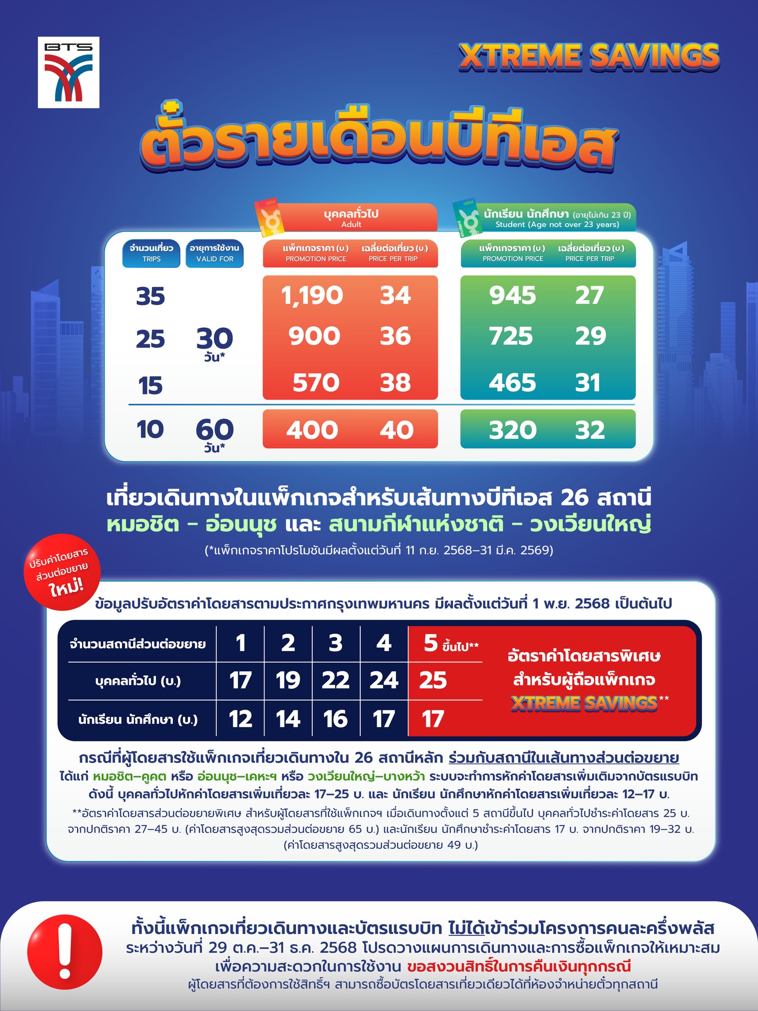 โดยรถไฟฟ้า BTS เปิดเผยอัตราค่าโดยสารพิเศษสำหรับผู้ใช้งานแพ็กเกจตั๋วเที่ยวรายเดือนของ BTS และเดินทางในสถานีหลัก ร่วมกับสถานีส่วนต่อขยาย ดังนี้