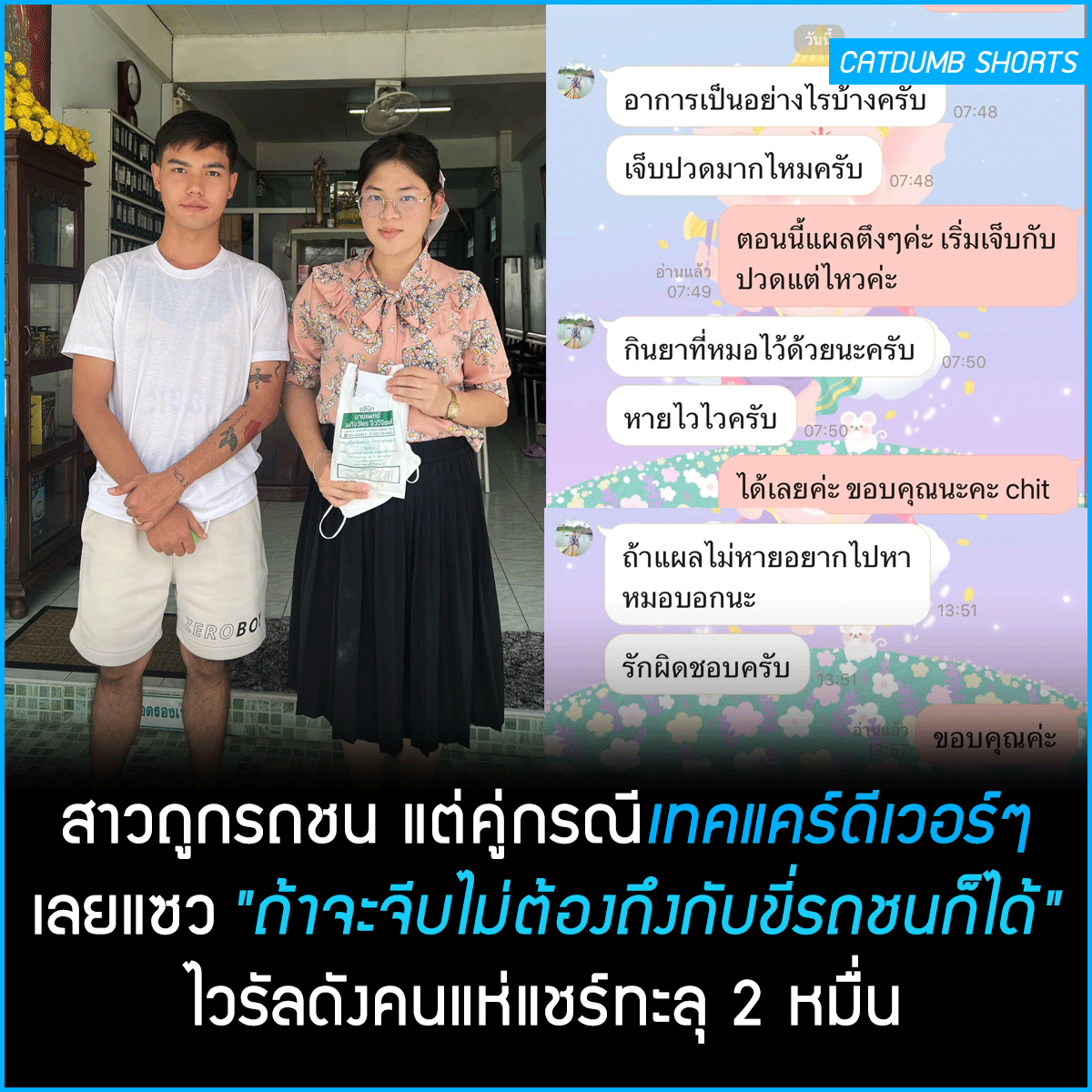 เผยแพร่ 02 มิ.ย. 2566 เวลา 04.39 น. • CatDumb - แคทดั๊มบ์ | เล่าเรื่องน่าสนใจ ในแบบที่แมวก็เข้าใจง่ายๆกลายเป็นเรื่องราวไวรัลร้อนแรงวันนี้เลยครับ จากการที่สาวถูกรถชน แต่คู่กรณีเทคแคร์ดี เลยโพสต์แซว "ถ้าจะจีบไม่ต้องถึงกับขี่รถชนหนูก็ได้นะคะ" ทำเอาไวรัลดังแห่แชร์ทะลุ 2 หมื่น