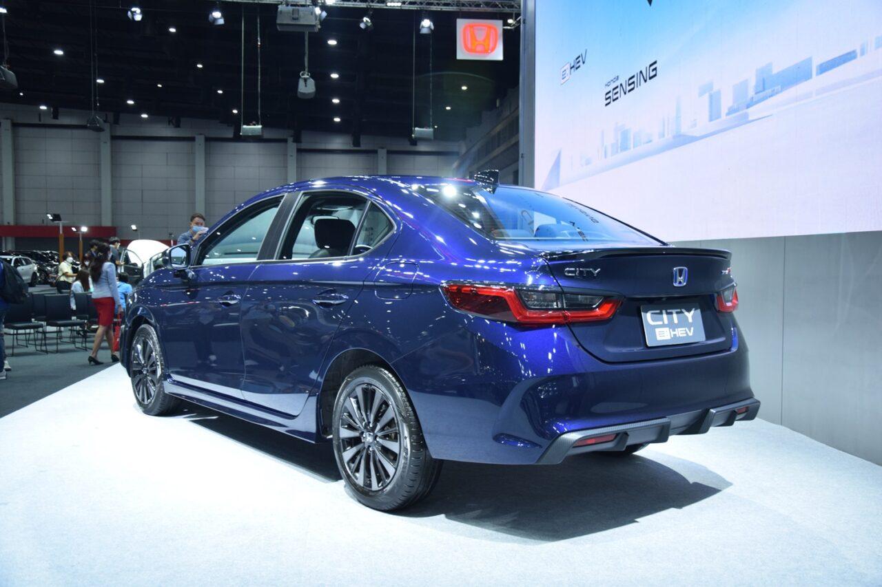 Honda City e:HEV หน้าตาภายนอกตั้งแต่กระจังหน้าดีไซน์ใหม่เน้นช่องระบายอากาศรังผึ้งใหญ่ขึ้นขอบโครเมียมประกบไฟหน้า Projector เปิดปิดอัตโนมัติ พร้อมไฟส่องสว่างเวลากลางวัน LED รับกับกันชนหน้าใหม่ กระจกมองพร้อมไฟเลี้ยว ไฟที่เปิดประตูโครเมียม ท้าย LED กันชนหลังออกแบบใหม่เน้นเส้นสายส่วนล่างเรียบง่ายและมีลิ้นสปอยเลอร์หลังแนวนอนประดับด้วยไฟเรืองแสงทับทิมหลัง เสาอากาศแบบครีบฉลามสีเดียวกับตัวรถและล้ออัลลอยขนาด 15 นิ้ว พร้อมยางขนาด 185/60R15