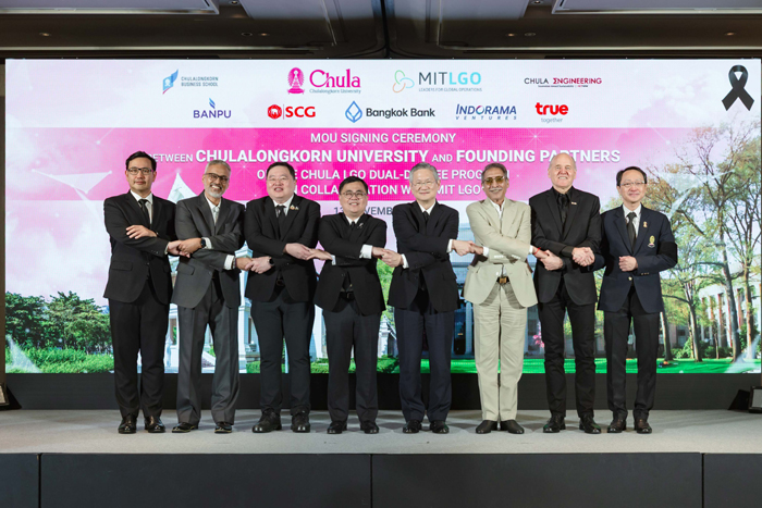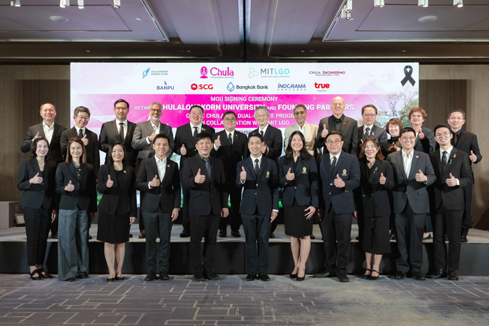 สร้างมิติใหม่ ปฏิวัติวงการศึกษาไทย…จุฬาลงกรณ์มหาวิทยาลัย ร่วมกับ Massachusetts Institute of Technology (MIT) สหรัฐอเมริกา ผสานกำลังกับ 5 องค์กรธุรกิจพันธมิตรชั้นนำ ได้แก่ บริษัท ทรู คอร์ปอเรชั่น จำกัด (มหาชน), ธนาคารกรุงเทพ จำกัด (มหาชน), บริษัท ปูนซิเมนต์ไทย จำกัด (มหาชน), บริษัท อินโดรามา เวนเจอร์ส จำกัด (มหาชน) และบริษัท บ้านปู จำกัด (มหาชน) เปิดหลักสูตรปริญญาโทรูปแบบใหม่ Chula Leaders for Global Operations (Chula LGO) ซึ่งเป็นหลักสูตรสองปริญญาโท จากคณะวิศวกรรมศาสตร์ และคณะพาณิชยศาสตร์และการบัญชี โดยผู้สำเร็จการศึกษาจะได้รับปริญญา วท.ม. สาขานวัตวิศวกรรมเพื่อความยั่งยืน (Master of Science in Innovative Engineering for Sustainability) และ บธ.ม. สาขาบริหารธุรกิจมหาบัณฑิต (Master of Business Administration) พร้อมด้วยประกาศนียบัตร MIT LGO เพื่อเร่งสร้างผู้นำรุ่นใหม่เปี่ยมด้วยทักษะและศักยภาพทัดเทียมนานาชาติ อีกหนึ่งแรงขับเคลื่อนสำคัญในการพัฒนาภาคอุตสาหกรรมให้ก้าวทันโลกแห่งอนาคต และสร้างเศรษฐกิจประเทศชาติอย่างยั่งยืน โดยครั้งนี้ ศาสตราจารย์ ดร.วิเลิศ ภูริวัชร (ที่ 3 จากซ้าย) อธิการบดีจุฬาลงกรณ์มหาวิทยาลัย พร้อมด้วยผู้บริหารจาก 5 องค์กรพันธมิตร รวมถึง นายซิกเว่ เบรกเก้ (ขวา) ประธานคณะผู้บริหารกลุ่ม บริษัท ทรู คอร์ปอเรชั่น จำกัด (มหาชน) ได้ร่วมลงนามบันทึกข้อตกลงความร่วมมือ Chula LGO อย่างเป็นทางการ ณ ห้อง Yulania ชั้น 9 วอลดอร์ฟ แอสโทเรีย กรุงเทพฯ