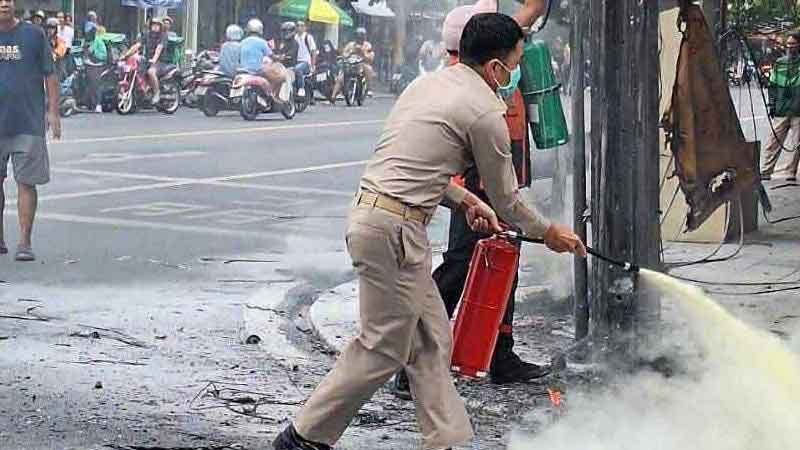 รู้แล้วใคร ชายสวมชุดข้าราชการ คว้าถังดับเพลิง ดับไฟไหม้สายไฟสายสื่อสาร สี่แยกวังหิน