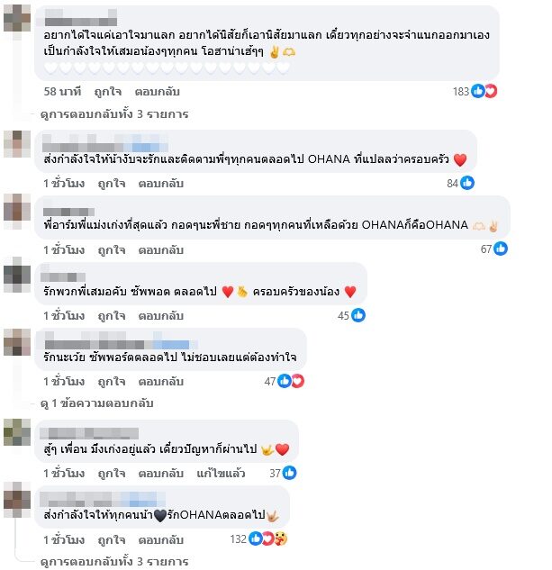 โดยคอมเมนต์ต่างเข้ามาให้กำลังใจ พร้อมทั้งส่งกอดให้กับ อาร์ม และทุกคนที่เหลือด้วยว่าเก่งมากๆ อาทิ อยากได้ใจแค่เอาใจมาแลก อยากได้นิสัยก็เอานิสัยมาแลก เดี๋ยวทุกอย่างจะจำแนกออกมาเอง เป็นกำลังใจให้เสมอน้องๆทุกคน โอฮาน่าเฮ้ๆๆ , พี่อาร์มพี่แม่งเก่งที่สุดแล้ว กอดๆนะพี่ชาย กอดๆทุกคนที่เหลือด้วย OHANAก็คือOHANA , พวกนายโคตรเข้มแข็ง เป็นต้น