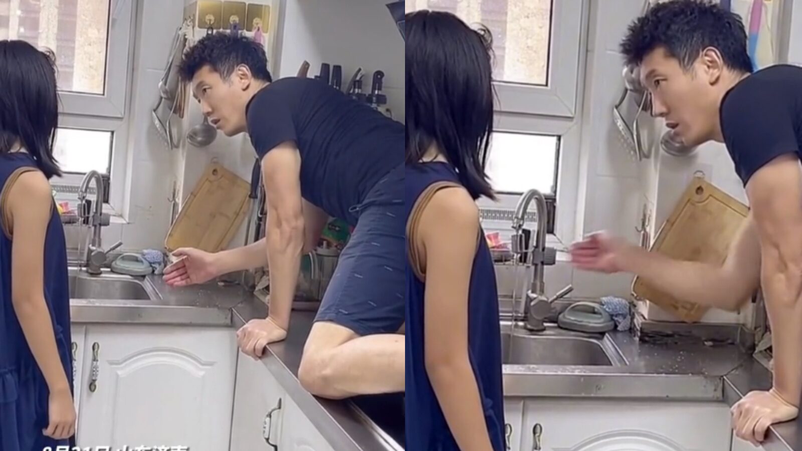 จากวิดีโอ คุณพ่อคลานสี่ขาอยู่บนเคาน์เตอร์ในห้องครัว และปัดจานชามให้หล่นจากเคาน์เตอร์ จากนั้นก็กวักน้ำตรงอ่างล้างจานเหมือนที่แมวหลายตัวชอบทำ