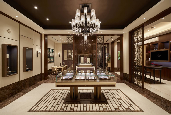 บูติกแห่งนี้มีพื้นที่ถึง 108.5 ตารางเมตร ภายใต้งานออกแบบอันสง่างามและร่วมสมัย พร้อมทั้งแนวคิดของการตก แต่งด้านหน้าบูติก (Façade) แบบใหม่ของแบรนด์ ตลอดจนด้านนอกซึ่งตกแต่งด้วยผนังหินเซาะร่องตัดกับแผ่นผนังตกแต่งลวดลายรวมถึงผนังซึ่งบุจากหนังที่เป็นส่วนหนึ่งของตู้กระจกจัดแสดงผลงาน ประตูหลักของบูติกทำด้วย กระจกแกะสลัก และตกแต่งด้วยโลโก้ของแบรนด์บริเวณด้านบน รวมถึงสัญลักษณ์ คาลาทราวา ครอส (Calatrava Cross) ประดับอยู่บนแผ่นโลหะเซาะร่องอย่างสง่างาม