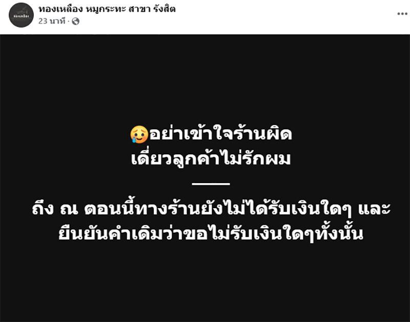 ล่าสุดเวลา 20.45 น. เจ้าของร้านหมูกระทะ ได้โพสต์เฟซบุ๊กอีกว่า "อย่าเข้าใจร้านผิด เดี๋ยวลูกค้าไม่รักผม ถึง ณ ตอนนี้ทางร้านยังไม่ได้รับเงินใดๆ และยืนยันคำเดิมว่าขอไม่รับเงินใดๆ ทั้งนั้น"