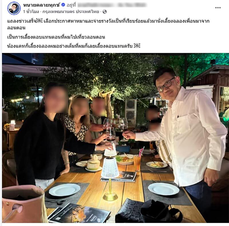 ต่อมาเวลา 18.45 น. ทนายเดชา ได้โพสต์เฟซบุ๊กหลังแถลงข่าวว่า"แถลงข่าวเสร็จเรื่องประกาศหาหมาและจ่ายรางวัลเป็นที่เรียบร้อยแล้วมานั่งเลี้ยงฉลองเพื่อนมาจากลอนดอน"