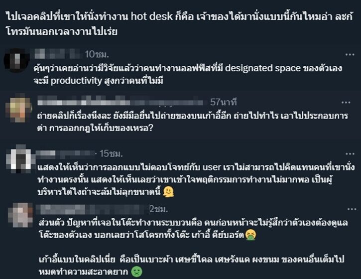 บางคนก็เข้ามาแชร์การใช้งานโต๊ะส่วนกลางว่า เคยเจอคนที่ใช้งานก่อนหน้าไม่รักษาความสะอาด สกปรกจนไม่อยากใช้ร่วม