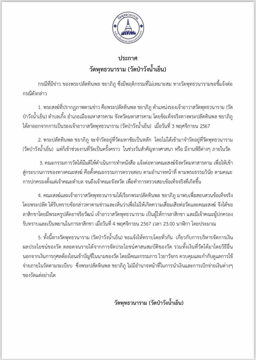 1.พระสงฆ์ที่ปรากฏภาพตามข่าว คือพระปลัดทินพล ชยาภิภู ตําแหน่งรองเจ้าอาวาสวัดพุทธวนาราม (วัดป่าวังน้ำเย็น) ตําบลเกิ้ง อำเภอเมืองมหาสารคาม จังหวัดมหาสารคาม โดยข้อเท็จจริงทางพระปลัดทินพล ชยาภิภู ได้ลาออกจากการเป็นรองเจ้าอาวาสวัดพุทธวนาราม (วัดป่าวังนํ้าเย็น) เมื่อวันที่ 3 พฤศจิกายน 2567