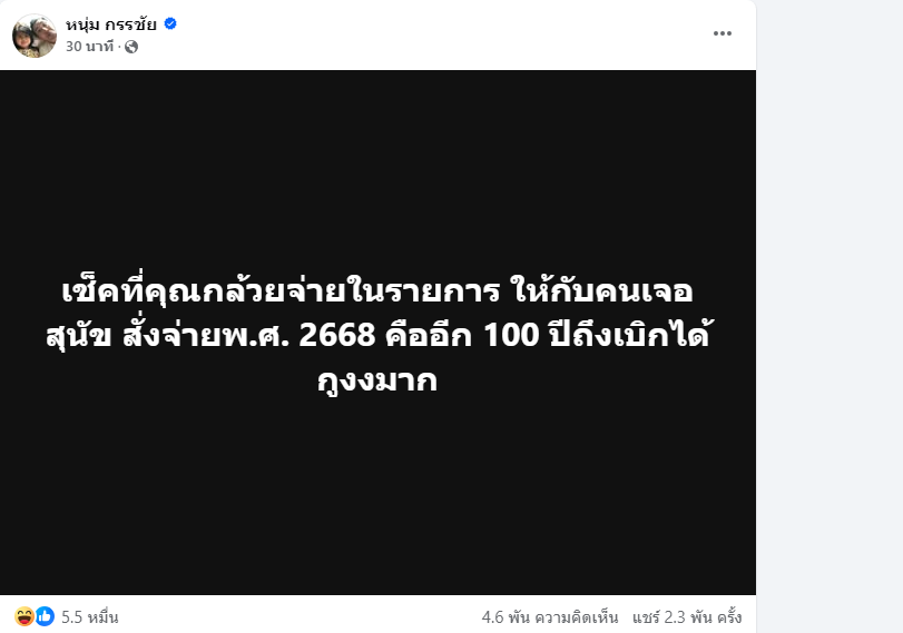 ล่าสุดเพจ หนุ่ม กรรชัย โพสต์ข้อความถึงเรื่องนี้ด้วยว่า "เช็คที่คุณกล้วย จ่ายในรายการ ให้กับคนเจอสุนัข สั่งจ่ายพ.ศ.2668 คืออีก 100 ปีถึงเบิกได้ กูงงมาก"