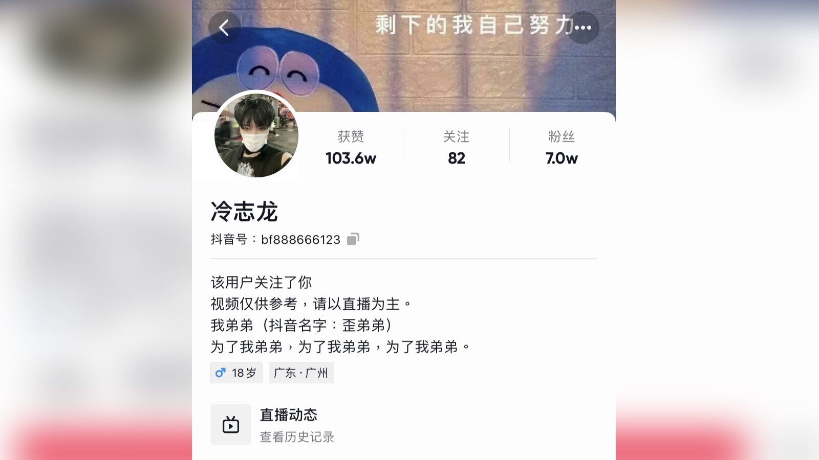 ไม่แน่ชัดว่าจะเป็นคนเดียวกันหรือไม่ แต่สิ่งหนึ่งที่พิสูจน์ได้คือเขามีจิตใจดีและรักน้องชายมาก เขาเคยกล่าวไว้ว่าสาเหตุที่เล่นโต่วอินเพราะอยากให้น้องชายมีความสุข น้องชายเป็นคนไม่ค่อยมีเพื่อนจึงชอบเล่นโต่วอินเป็นอย่างมาก เขาไม่อยากให้น้องชายรู้สึกเหงาจึงสมัครมาเล่นเป็นเพื่อน ไม่ว่าจะเป็นบนโปรไฟล์ หรือวิดีโอ เขาก็จะมักเขียนกำกับว่า "เพื่อน้องชาย" ไว้เสมอ