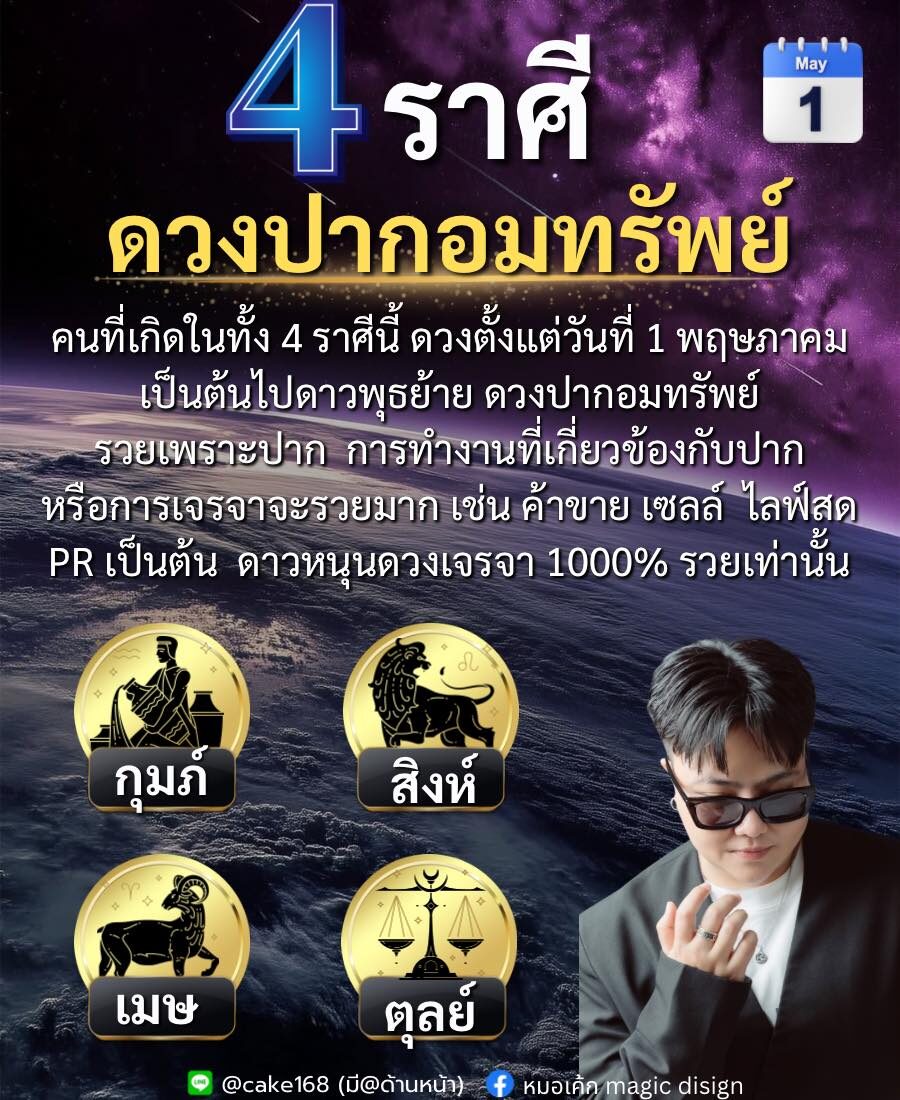 หมอเค้กMagicdesign เผยถึงดวงชะตา 4 ราศี ดวงปากอมทรัพย์ คนที่เกิดทั้ง 4 ราศีนี้ ดวงตั้งแต่วันที่ 1 พ.ค.2568 เป็นต้นไป ดาวพุธย้าย ดวงปากอมทรัพย์ รวยเพราะปาก การทำงานที่เกี่ยวข้องกับปาก หรือการเจรจาจะรวยมาก เช่น ค้าขาย ไลฟ์สด พีอาร์ ดวงหนุนการเจรจา 1 พันเปอร์เซ็นต์ รวยเท่านั้น