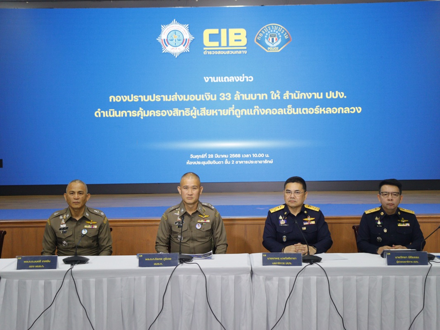ตำรวจสอบสวนกลางส่งมอบเงิน 33 ล้านบาทให้สำนักงาน ปปง.ช่วยผู้เสียหายที่ถูกแก๊งคอลเซ็นเตอร์หลอก