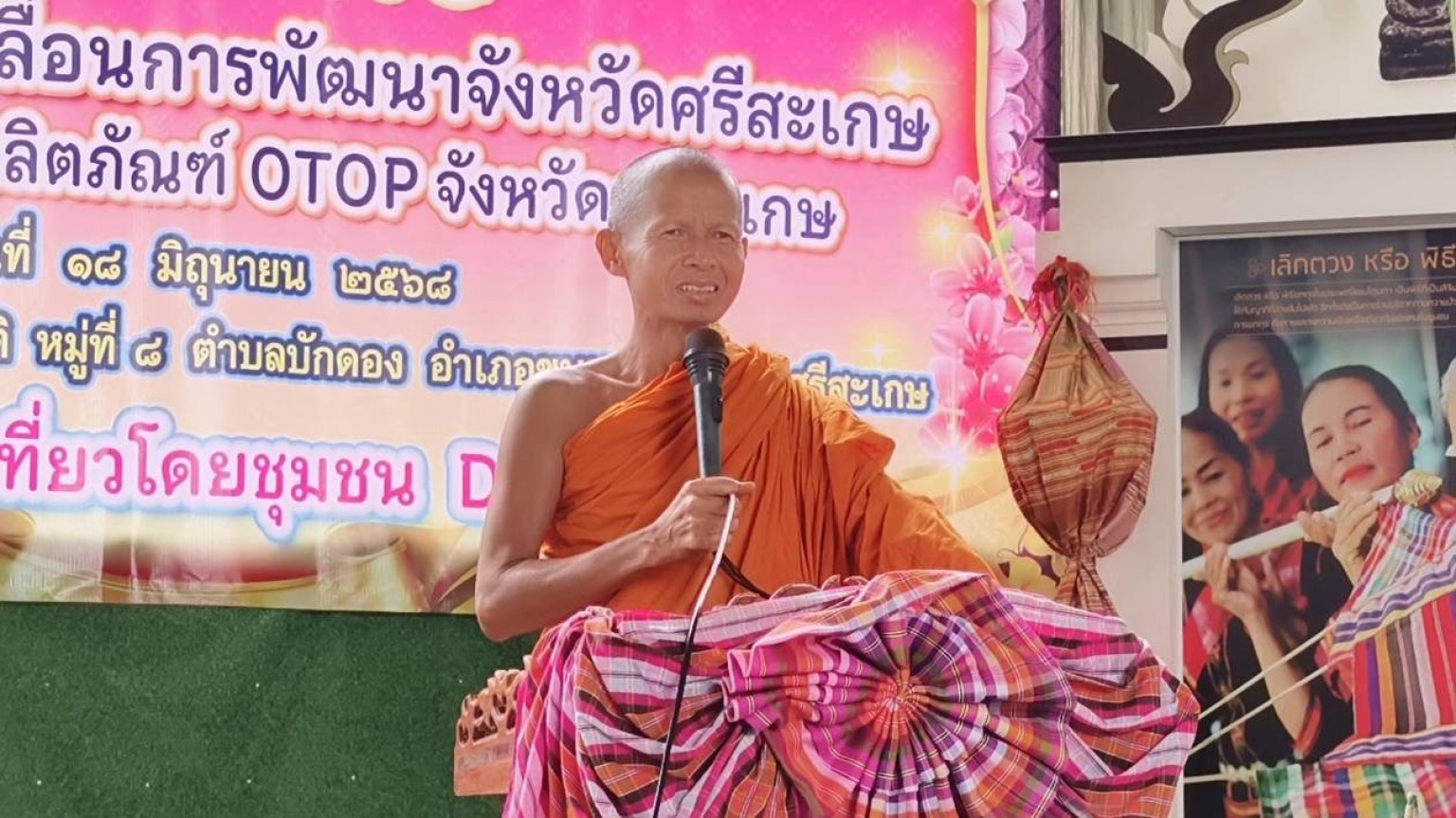 ผู้สื่อข่าวรายงาน ว่า เมื่อวันที่ 19 มิ.ย. 68 ที่วัดสำโรงเกียรติ ต.บักดอง อ.ขุนหาญ จ.ศรีสะเกษ นางสาวชนมณัฐ รอดบุญธรรม รองผู้ว่าราชการจังหวัดศรีสะเกษ พร้อมด้วย นางทรัพย์สิน โพธิ์ขาว พัฒนาการจังหวัดศรีสะเกษ นายวิทยา วิรารัตน์ ประธานสภาวัฒนธรรมจังหวัดศรีสะเกษ และหัวหน้าส่วนราชการที่เกี่ยวข้อง นำคณะคณะกรรมการขับเคลื่อนวาระผ้าทอมือและผลิตภัณฑ์ OTOP ศรีสะเกษ ลงพื้นที่ตรวจเยี่ยมผลการดำเนินงานกิจกรรมโครงการดังกล่าว โดยมี พระครูอรุณ ปุณโญภาส เจ้าอาวาสวัดสำโรงเกียรติ พร้อมด้วย นายปวิช รัตวาลย์ นายอำเภอขุนหาญ นำส่วนราชการระดับอำเภอ ผู้นำท้องที่ ท้องถิ่น และประชาชนในพื้นที่ให้การต้อนรับ โอกาสนี้ได้รับความเมตตาจาก พระครูศรีโพธาลังการ รองเจ้าคณะจังหวัดศรีสะเกษ ร่วมเป็นประธานฝ่ายสงฆ์ ด้วย