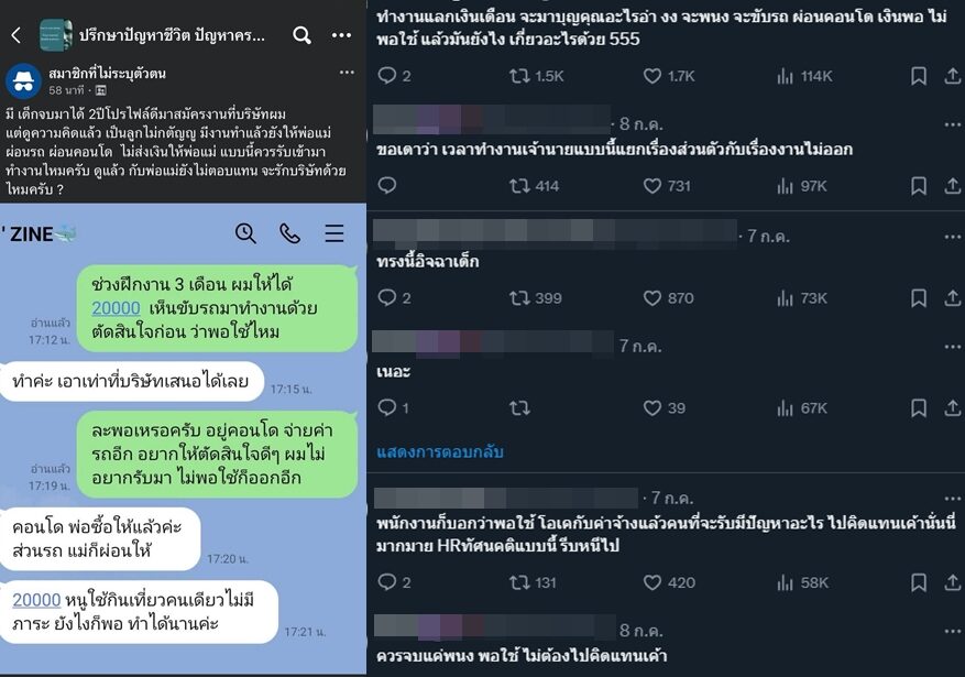 ฝ่ายนายจ้างบอกว่า "ช่วงฝึกงาน 3 เดือน ผมให้ได้ 20,000 เห็นขับรถมาทำงานด้วย ตัดสินใจก่อนว่าพอใช้ไหม" ด้านพนักงานตอบว่า "ทำค่ะ เอาเท่าที่บริษัทเสนอได้เลย" เขาจึงตอบกลับไปว่า "ละพอเหรอครับ อยู่คอนโด จ่ายค่ารถอีก อยากให้ตัดสินใจดีๆ ผมไม่อยากรับมา ไม่พอใช้ก็ออกอีก"