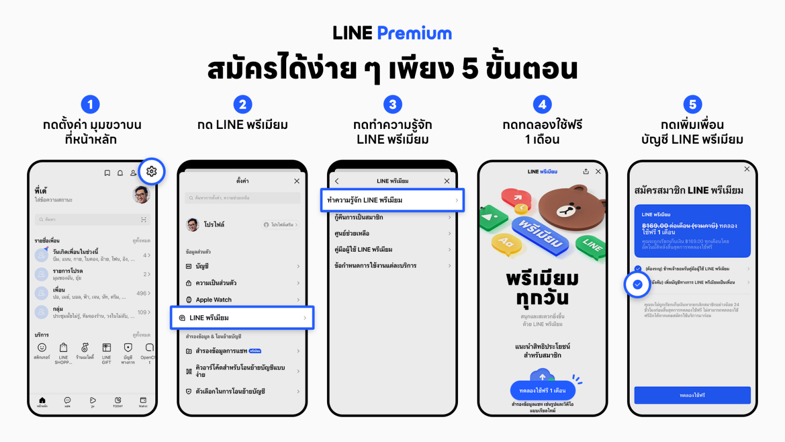 สมัคร LINE Premium ได้แล้ววันนี้ ทดลองใช้ฟรี 1 เดือน ได้ที่ https://lin.ee/C40rCpG/wcvn (กดผ่านมือถือเท่านั้น) หรือไปยังแถบ “หน้าหลัก” ในแอปฯ LINE เลือก “ตั้งค่า” เลือก “LINE Premium” และเลือก “ทำความรู้จัก LINE Premium” เพื่อกดยอมรับข้อกำหนดให้เรียบร้อย และกด “ทดลองใช้ฟรี 1 เดือน” โดยจะทำการเชื่อมต่อกับระบบชำระเงินผ่าน App Store หรือ Google Play ผู้สนใจ สามารถเพิ่มบัญชีทางการเพื่อรับข่าวสารล่าสุดจาก LINE Premium ได้แล้วที่ @line_premium_th