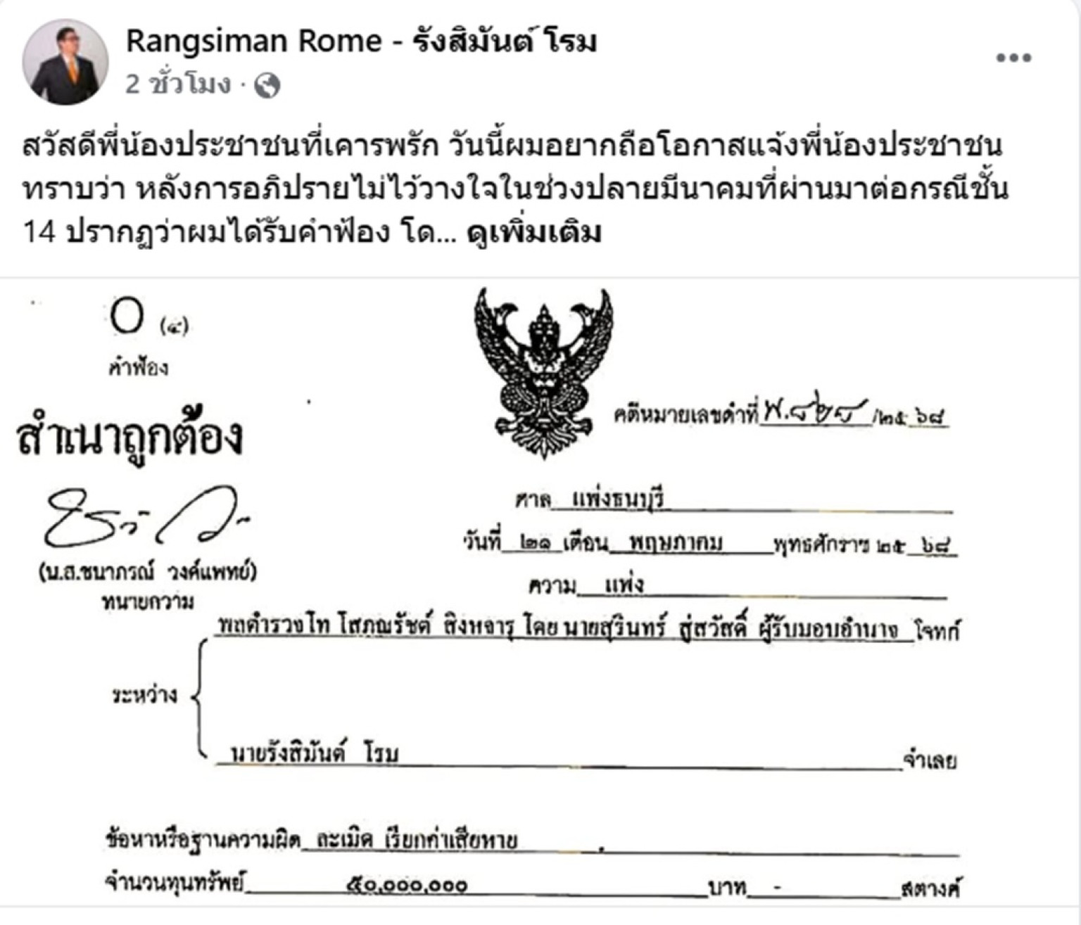 สวัสดีพี่น้องประชาชนที่เคารพรัก วันนี้ผมอยากถือโอกาสแจ้งพี่น้องประชาชนทราบว่า หลังการอภิปรายไม่ไว้วางใจในช่วงปลายมีนาคมที่ผ่านมาต่อกรณีชั้น 14 ปรากฏว่าผมได้รับคำฟ้อง โดย พล.ต.ท. โสภณรัชต์ สิงหจารุ หรืออดีตแพทย์ใหญ่ที่พัวพันกับกรณีชั้น 14 โดยการฟ้องครั้งนี้เป็นการฟ้องต่อศาลแพ่งในข้อหาละเมิด โดยเรียกค่าเสียหายเป็นเงิน 50 ล้านบาท