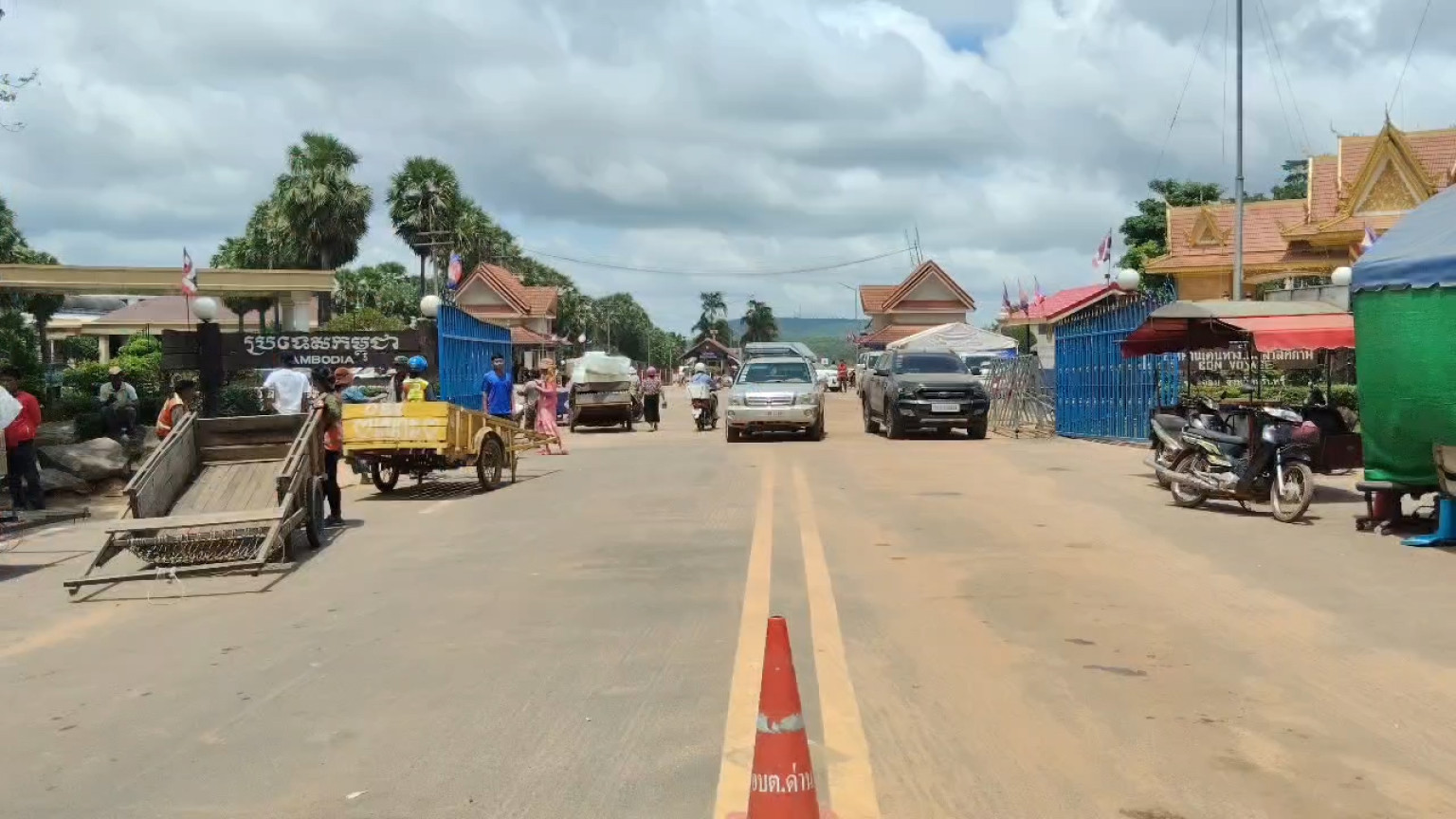 นายสุทธิโรจน์ เจริญธนศักดิ์ นายอำเภอกาบเชิง กล่าวว่า วันนี้ด่านเปิดปกติ ชาวกัมพูชาเข้าออกปกติ ส่วนคนไทยที่ไปเล่นกาสิโน ไม่ให้ไป ส่วนรถที่ไปรับมันสำปะหลัง ก็ให้ชะลอไว้ก่อน เพราะเกรงว่าออกไปแล้วจะเข้ามาไทยไม่ทันเพราะด่านปิดบ่ายสาม เราก็เป็นห่วงคนไทย เพราะถ้าด่านปิดรถก็จะต้องค้างจึงชะลอไว้ก่อน ส่วนปัญหาเกี่ยวกับมันสำปะหลังไม่น่าเป็นห่วงเพราะในประเทศไทยก็มีผลผลิตมันสำปะหลังเยอะ ส่วนมากสินค้าที่เข้ามาก็จะเป็นมันสำปะหลัง ส่วนผู้ป่วยชาวกัมพูชาเราก็ยังอำนวยความสะดวกปกติ ทั้งนี้ความสัมพันธ์บริเวณชายแดน จ.สุรินทร์ มีความสัมพันธ์ที่ดี ซึ่งเราก็จะปฏิบัติตามเงื่อนไขทางฝ่ายความมั่นคงที่ได้แจ้งมา ส่วนการเตรียมพร้อมรับมือสถานการร์ที่ไม่คาดคิด เกี่ยวกับความปลอดภัยของประชาชน เราได้ประชุมทุกภาคส่วนทั้งหมู่บ้านและตำบลต่างๆ ถ้ามีกรณีฉุกเฉินที่ต้องเผชิญเหตุ เราก็มีจุดรวมพลให้ประชาชนไปรวมกันและเราได้มีการซักซ้อมไว้เรียบร้อย