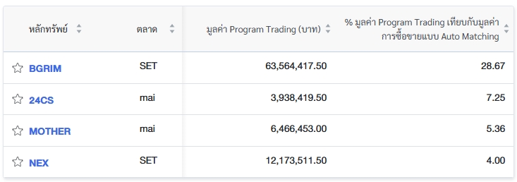 นอกจากนี้ ตลท.ยังรายงานข้อมูลหลักทรัพย์ที่ใช้ Program Trading ซื้อขายสูงสุด 4 อันดับ โดยเรียงจากเปอร์เซ็นต์ (%) มูลค่า Program Trading เทียบกับมูลค่าการซื้อขายแบบ Auto Matching ดังนี้