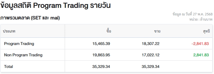 ขณะที่มูลค่าซื้อขายรายวันผ่าน Non Program Trading หรือ “การซื้อขายที่ไม่ใช่โปรแกรม” มีมูลค่าซื้อจำนวน 19,863.95 ล้านบาท และมูลค่าขายจำนวน 17,022.12 ล้านบาท เท่ากับซื้อสุทธิ 2,841.83 ล้านบาท