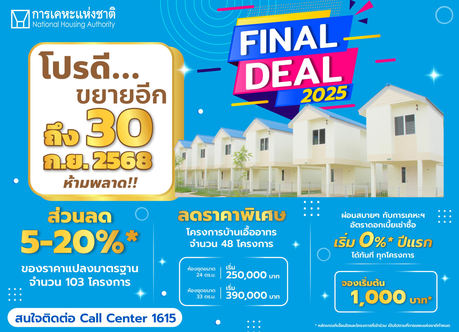 เมื่อวันที่ 24 กรกฎาคม 2568 นายทวีพงษ์ วิชัยดิษฐ ผู้ว่าการการเคหะแห่งชาติ เปิดเผยว่า จากความสำเร็จของแคมเปญก่อนหน้าที่ได้รับความสนใจอย่างล้นหลาม แต่ยังไม่สามารถรองรับความต้องการของประชาชนได้อย่างเพียงพอ การเคหะแห่งชาติได้จัดทำแคมเปญ “Final Deal 2025” ขึ้น เพื่อขยายโอกาสให้ประชาชนสามารถเข้าถึงที่อยู่อาศัยได้ครอบคลุมมากยิ่งขึ้น แคมเปญ “Final Deal 2025” ถือเป็นโอกาสสำคัญและเป็นครั้งสุดท้ายของปีที่ประชาชนสามารถเป็นเจ้าของบ้านในฝันได้จริง ภายใต้เงื่อนไขที่ดีที่สุด ทั้งในด้านราคา อัตราดอกเบี้ย และสิทธิประโยชน์ต่าง ๆ โดยมีโครงการเข้าร่วมกระจายทั่วประเทศ ครอบคลุมพื้นที่กรุงเทพฯ ปริมณฑล ได้แก่ โครงการเคหะชุมชนบางพลี วาระ 2, บ้านเอื้ออาทรรามอินทรา (คู้บอน) เฟส 1, เคหะชุมชนนครปฐม ระยะ 2, เคหะชุมชนและบริการชุมชนนนทบุรี (วัดกู้ 3), เคหะชุมชนและบริการชุมชนลาดกระบัง 2 ระยะ 3/1 และภูมิภาค ได้แก่ โครงการเคหะชุมชนและบริการชุมชนจังหวัดชลบุรี (ห้วยกะปิ) เคหะชุมชนและบริการชุมชนขอนแก่น เมืองเก่า-กรีนวิลล์ ระยะ 1, เคหะชุมชนและบริการชุมชนจังหวัดกระบี่ (กระบี่น้อย), เคหะชุมชนและบริการชุมชนจังหวัดอุดรธานี (สามพร้าว) ระยะที่ 1 เป็นต้น