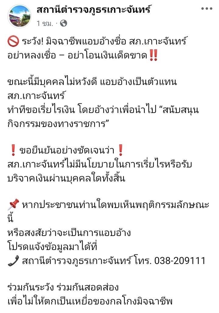 โดยอ้างว่าเพื่อนำไปสนับสนุนกิจกรรมของทางราชการ ขอยืนยันอย่างชัดเจนว่า สภ.เกาะจันทร์ไม่มีนโยบายในการเรี่ยไรหรือรับบริจาคเงินผ่านบุคคลใดทั้งสิ้น หากประชาชนท่านใดพบเห็นพฤติกรรมลักษณะหรือสงสัยว่าจะเป็นการแอบอ้าง โปรดแจ้งข้อมูลมาได้ที่สถานีตำรวจภูธรเกาะจันทร์ โทร. 038-209111