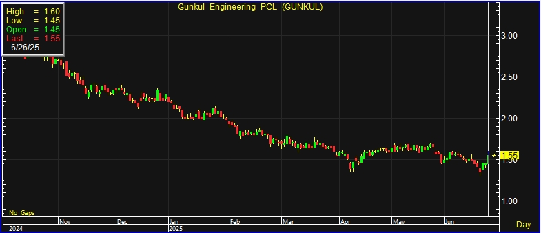 สำหรับราคาหุ้นดีดกลับขึ้นมา ตอบรับข่าว ที่ประชุมคณะกรรมการบริษัท GUNKUL ครั้งที่ 4/2568 เมื่อวันที่ 23 มิถุนายน 2568 มีมติอนุมัติการจำหน่ายหุ้นสามัญในสัดส่วน 50% ของทุนจดทะเบียนของบริษัทในเครือ ได้แก่ บริษัท กันกุล วัน เอ็นเนอร์ยี 2 จำกัด (GOE2) และบริษัท กันกุล โซลาร์ พาวเวอร์เจน จำกัด (GSPG) ให้แก่บริษัท กัลฟ์ รีนิวเอเบิล เอ็นเนอร์จี จำกัด (GULF RE) ซึ่งเป็นบริษัทในเครือของ GULF