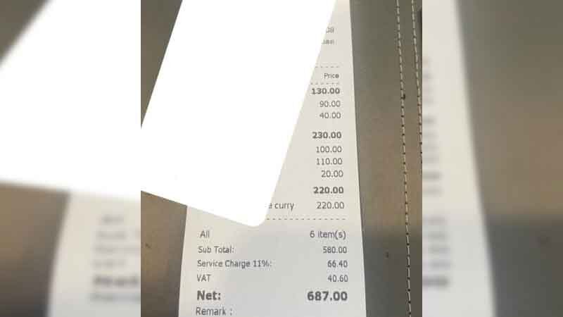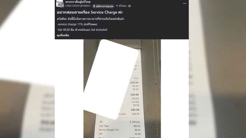 โดยพบว่าใบเสร็จที่ทางร้านคิดราคาอาหาร 580 บาท รวมค่า “service charge” 11% อีก 66 บาท
