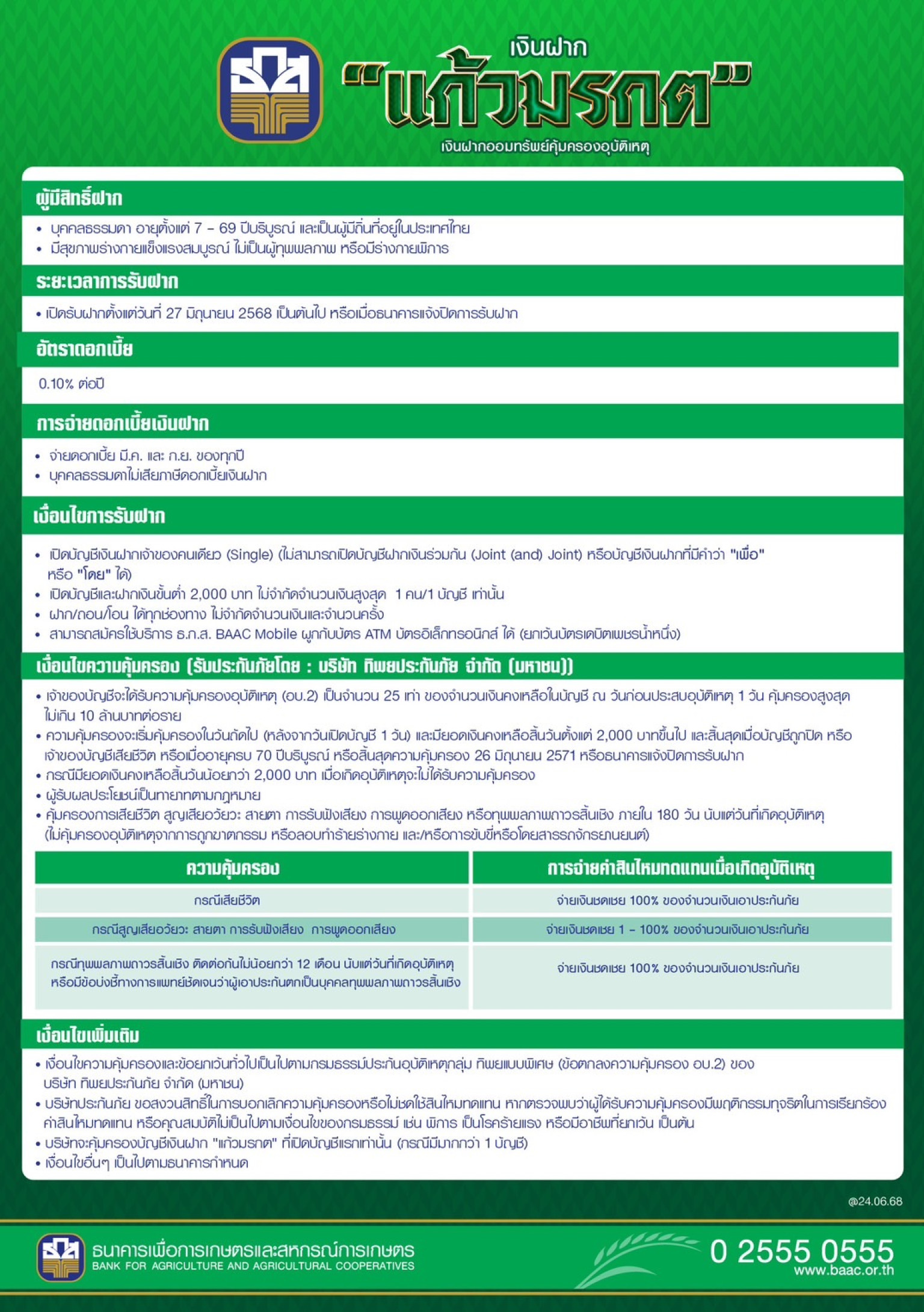 เปิดรับฝากตั้งแต่วันที่ 27 มิถุนายน 2568 เป็นต้นไป ที่ ธ.ก.ส. ทุกสาขาทั่วประเทศ หรือจนกว่าธนาคารจะแจ้งการปิดรับฝาก หรือสอบถามรายละเอียด เพิ่มเติมได้ที่ Call Center 02-555-0555 หรือ Facebook ธกส BAAC Thailand หรือ Line OA: @baacfamily