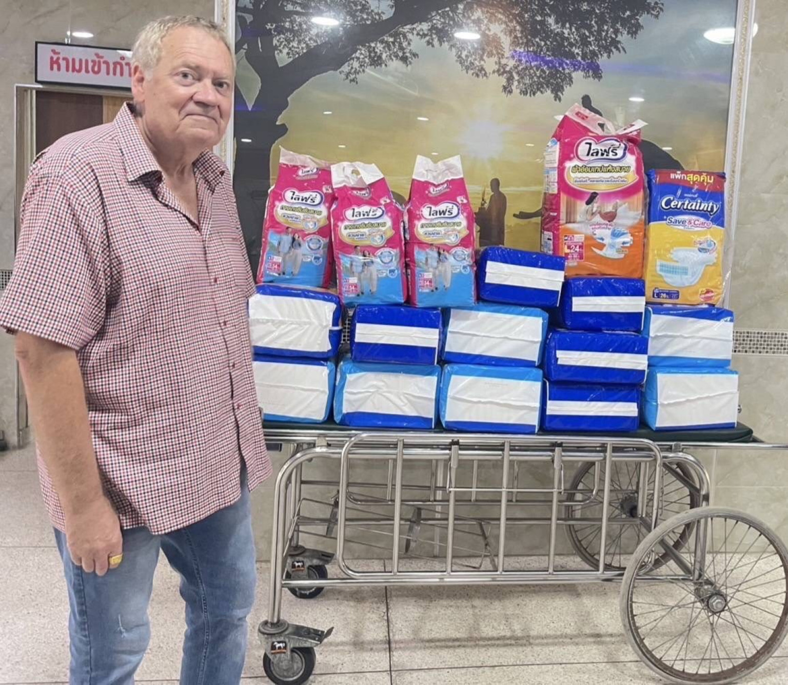 ฝรั่งหัวใจไทยและภรรยาฉลองวันเกิดด้วยการมอบผ้าอ้อมสำเร็จรูปให้โรงพยาบาลและเครื่องอุปโภคบริโภคให้ศูนย์อพยพในพื้นที่อำเภอศรีณรงค์