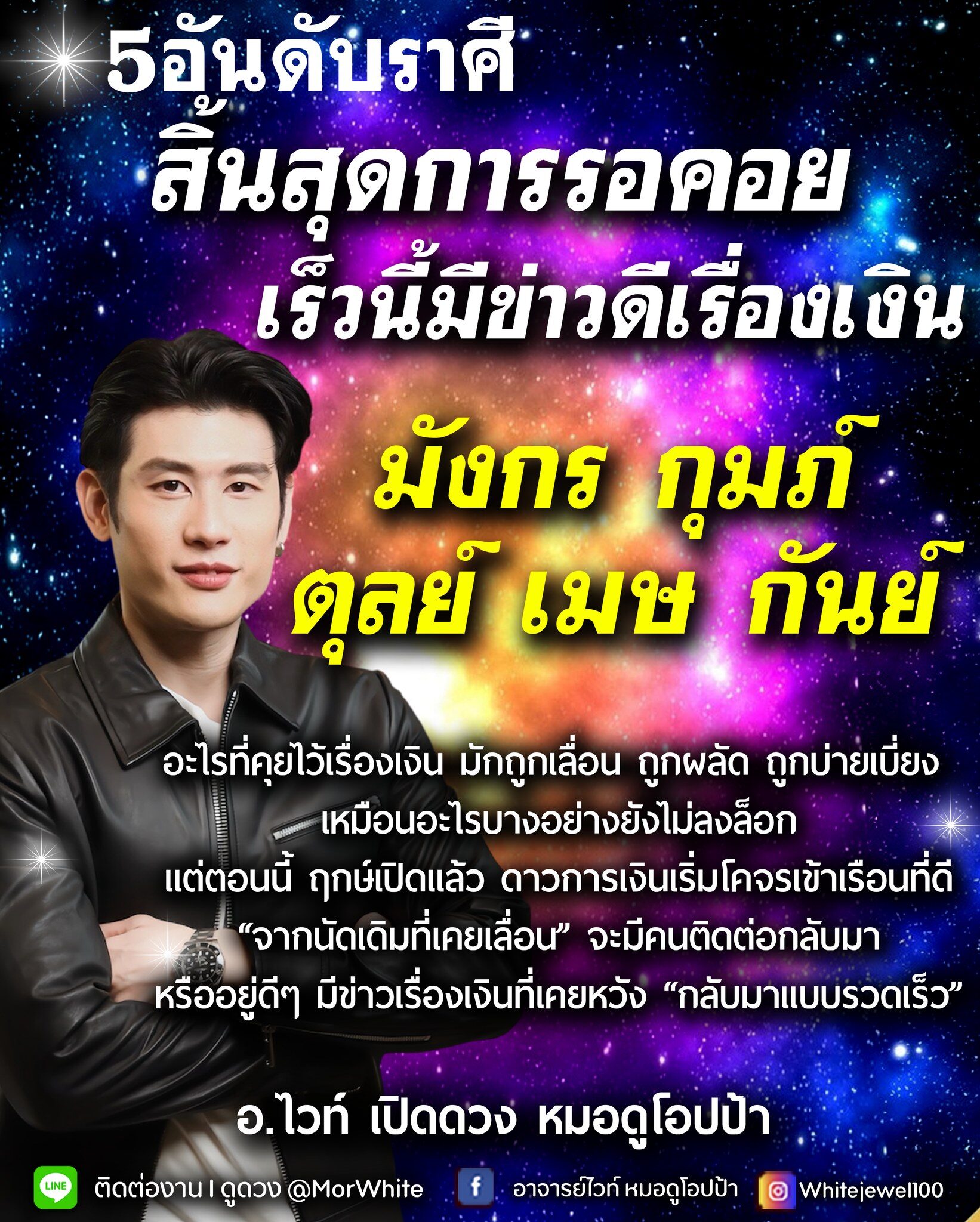 อาจารย์ไวท์ หมอดูโอปป้า เผยถึง 5 อันดับดวงชะตาราศี สิ้นสุดการรอคอย เร็วนี้มีข่าวดีเรื่องเงิน อะไรที่คุยไว้เรื่องเงิน มักถูกเลื่อน ถูกผลัด ถูกบ่ายเบี่ยง เหมือนอะไรบางอย่างยังไม่ลงล็อก แต่ตอนนี้ฤกษ์เปิดแล้ว ดาวการเงินเริ่มโคจรเข้าเรือนที่ดี จากนัดเดิมที่เคยเลื่อน จะมีคนติดต่อกลับมา หรืออยู่ดีๆ มีข่าวเรื่องเงินที่เคยหวังกลับมาแบบรวดเร็ว