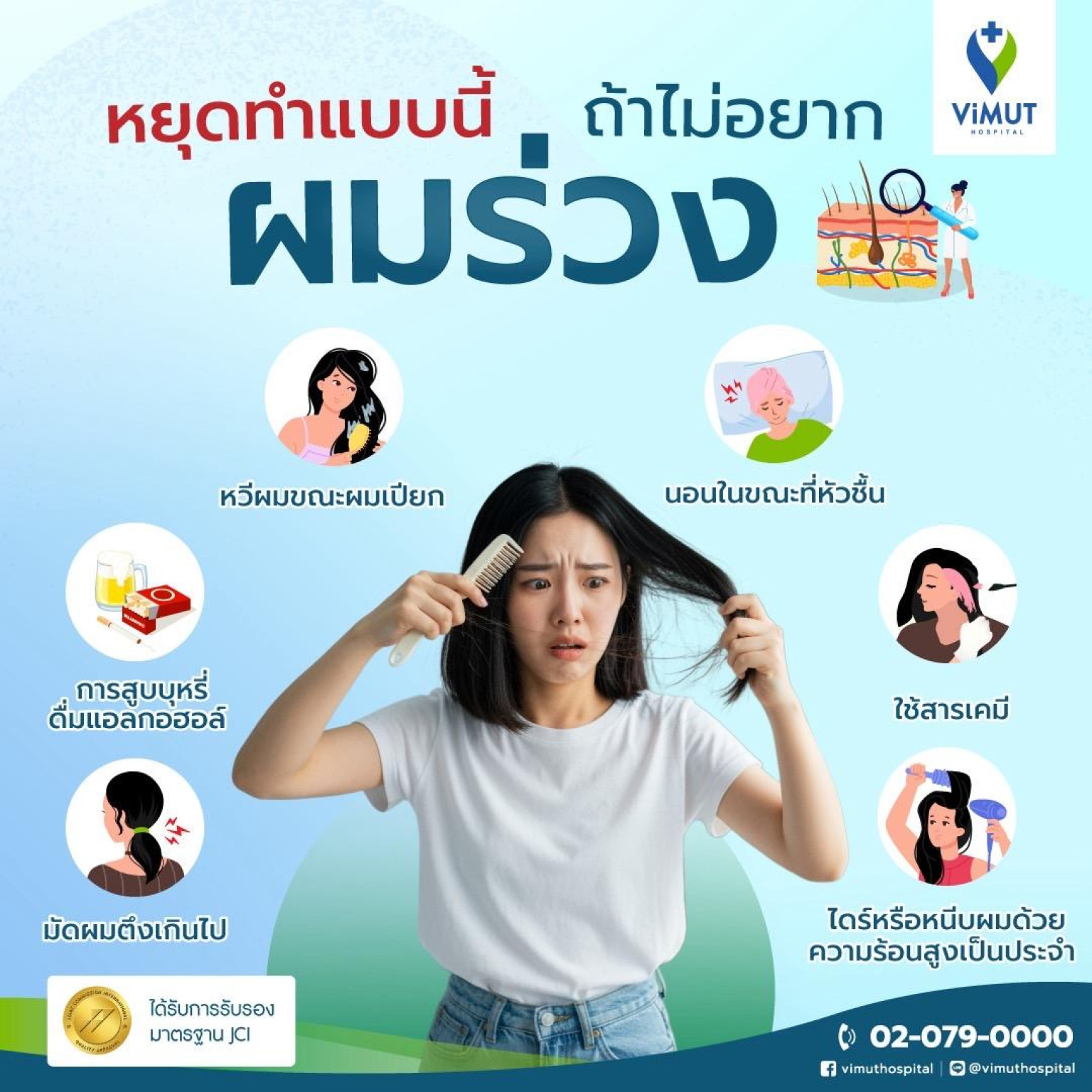 เชื่อว่าหลายคนคงเคยรู้สึกว่าทำไมผมร่วงเยอะจัง แค่หวีเบา ๆ หรือสระผมก็หลุดติดมือมาเป็นกำ ซึ่งเป็นปัญหาที่พบได้บ่อยในกลุ่มคนวัยทำงานที่ต้องแบกรับทั้งภาระหน้าที่และความเครียดสะสมในแต่ละวัน เพราะจริง ๆ แล้ว ความเครียดเป็นหนึ่งปัจจัยที่ส่งผลให้เส้นผมหลุดร่วงเร็วกว่าปกติและนำไปสู่ “ภาวะผมร่วง” ที่จะมีอาการผมร่วงอย่างต่อเนื่อง และหากปล่อยไว้นานเกินไป รากผมอาจเสียหายถาวรและไม่สามารถงอกขึ้นมาใหม่ได้ ส่งผลให้ผมน้อยลงอย่างเห็นได้ชัดจนเป็น “ภาวะผมบาง” ดังนั้นถ้าไม่อยากผมบางจนเสียความมั่นใจ พญ.กรผกา ขันติโกสุม แพทย์ผู้ชำนาญการด้านผิวหนัง ศูนย์ผิวหนังและความงาม รพ.วิมุต จะมาเล่าถึงสาเหตุที่ทำให้ผมร่วงมากผิดปกติและแชร์เทคนิคดูแลสุขภาพเส้นผมให้แข็งแรงขึ้น