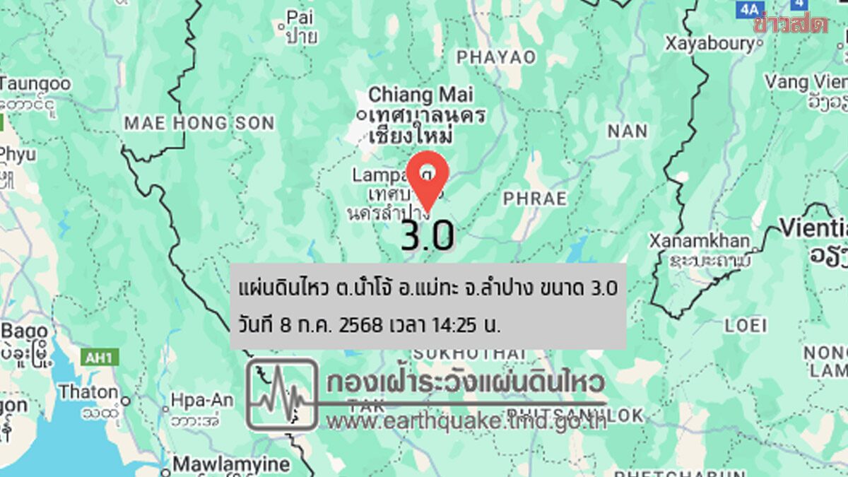 วันที่ 8 ก.ค.2568 ศูนย์ปฏิบัติการธรณีพิบัติภัย กรมทรัพยากรธรณี กระทรวงทรัพยากรธรรมชาติและสิ่งแวดล้อม (ทส.) รายงานการเกิดเหตุการณ์แผ่นดินไหวเมื่อเวลา 14.25 น. เกิดแผ่นดินไหวขนาด 3.0 ที่ระดับความลึก 1 กิโลเมตร จัดเป็นแผ่นดินไหวขนาดเล็ก (Minor) บริเวณต.น้ำโจ้ อ.แม่ทะ จ.ลำปาง