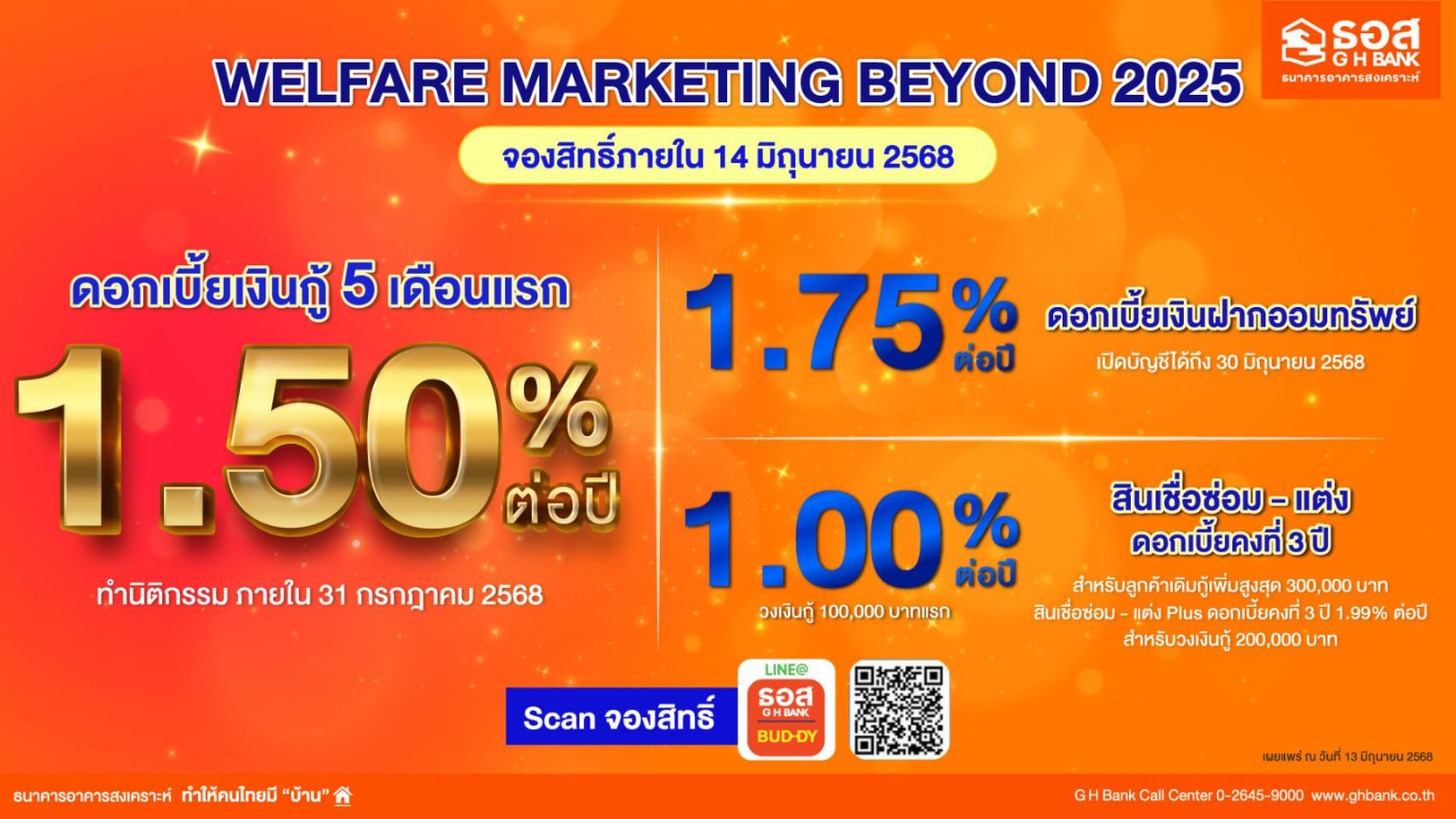โค้งสุดท้ายโปรฯงาน Welfare Marketing Beyond 2025 ลูกค้าสนใจจองสิทธิ์ผ่าน Line GHB Buddy ถึง 14 มิ.ย. 68