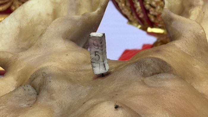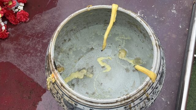และมีการจุดธูปเสี่ยงทายปักไปที่หัวหมูในพิธี (ซึ่งในทุกปีเมื่อจัดงานครบรอบปี จะมีการจุดธูปเสี่ยงทายปักไว้ที่หัวหมูเพื่อให้โชคผู้ศรัทธาที่มาร่วมงาน ซึ่งตัวเลขก็จะเข้ารางวัลทุกปี)