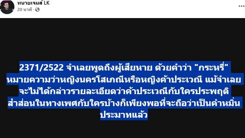ล่าสุดทนายดังอย่างทนายเจมส์ ได้โพสต์ข้อความระบุว่า 2371/2522 จำเลยพูดถึงผู้เสียหาย ด้วยคำว่า "กระหรี่" หมายความว่าหญิงนครโสเภณีหรือหญิงค้าประเวณี แม้จำเลยจะไม่ได้กล่าวรายละเอียดว่าค้าประเวณีกับใครประพฤติสำส่อนในทางเพศกับใครบ้างก็เพียงพอที่จะถือว่าเป็นคำหมิ่นประมาทแล้ว