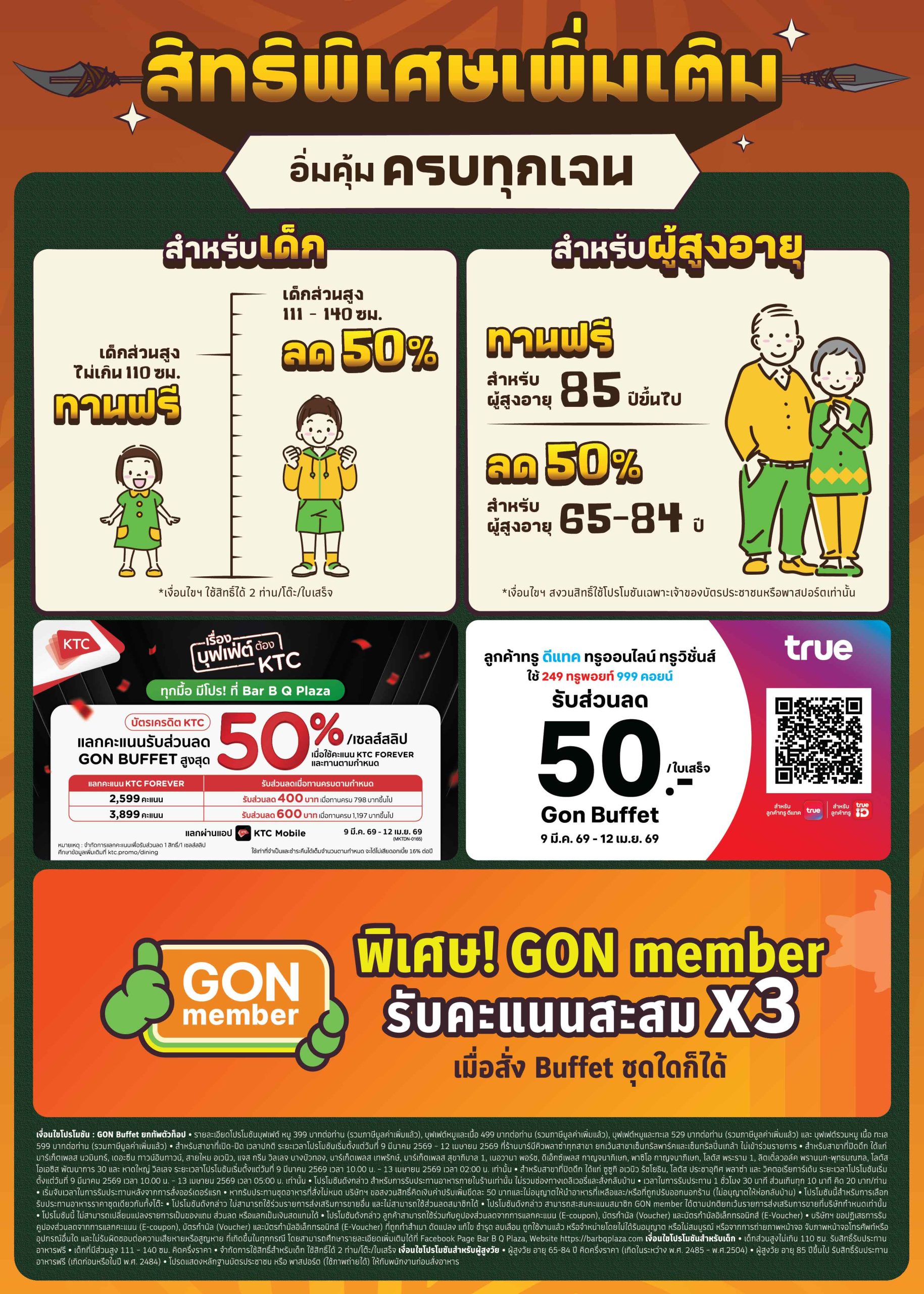 รัฐ กล่าวว่า สำหรับ ‘GON BUFFET ยกทัพตัวท็อป’ เราจัดเต็ม 35 วัน ตั้งแต่วันที่ 9 มีนาคม 2569 ถึง 12 เมษายน 2569 ที่ ร้านบาร์บีคิวพลาซ่า ทั่วประเทศ (ยกเว้น เซ็นทรัลพาร์ค และเซ็นทรัล ปิ่นเกล้า) ลูกค้ากินได้ทันที ไม่ต้องเป็นสมาชิก มีให้เลือก ตั้งแต่บุฟเฟต์ หมู ราคา 399 NET บาท/ท่าน, บุฟเฟต์หมูและเนื้อ ราคา 499 NET บาท/ท่าน, บุฟเฟต์หมูและทะเล ราคา 529 NET บาท/ท่าน และ บุฟเฟต์หมู เนื้อ ทะเล ราคา 599 NET บาท/ท่าน *ราคานี้รวมภาษีมูลค่าเพิ่มแล้ว