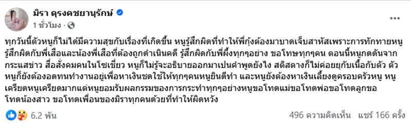 “หนูเครียดหนูเครียดมาก แต่หนูยอมรับผลกรรมของการกระทำทุกๆอย่างหนูขอโทษแม่ขอโทษพ่อขอโทษลูกขอโทษน้องสาว ขอโทษเพื่อนของมิราทุกคนด้วยที่ทำให้ผิดหวัง” โดยคอมเมนต์ส่วนใหญ่ต่างก็เข้ามาให้กำลังใจ มิรา ด้วย