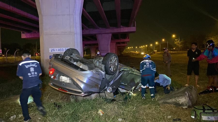 ในที่เกิดเหตุพบ รถเก๋ง ฮอนด้า รุ่น ซีวิค สีบรอนซ์เทา ทะเบียน 2กช-1579 กรุงเทพมหานคร สภาพพลิกคว่ำ รับความเสียหาย มี น.ส.พิมพ์วรีย์ ยาวิลิง อายุ 16 ปี ผู้ขับขี่ นอนเสียชีวิตอยู่บริเวณข้างรถคันเกิดเหตุ และมี น.ส.จุฑามณี สุทธิอาจ อายุ 22 ปี ผู้โดยสารติดอยู่ภายในรถบาดเจ็บสาหัส กู้ภัยนำส่งโรงพยาบาลภูมิพลฯ ส่วนผู้เสียชีวิตนำส่งชันสูตรสถาบันนิติเวช รพ.ตำรวจ