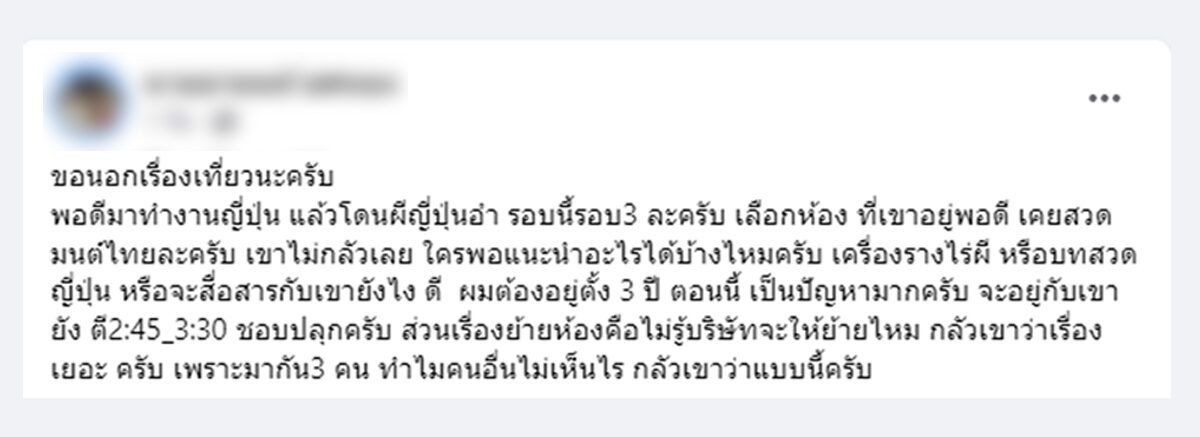 หนุ่มทำงานญี่ปุ่น เจอผีอำ ขอวิธีไล่ผี สวดมนต์ไทยแล้วไม่ช่วย คาดผีแปลไม่ออก ไม่รู้จะสื่อสารอย่างไร ต้องอยู่อีก 3 ปี วอนผู้รู้ช่วยแนะนำ