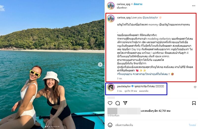หลังจากที่ สาวคารีสา ได้โพสต์ข้อความดังกล่าวออกไป ด้าน พอลล่า เทเลอร์ ก็ได้เข้ามาคอมเมนต์ว่า “พูดซะจะร้องไห้เลย” นับเป็นโมเมนต์ที่ซึ้ง อบอุ่น และน่ารักระหว่างพี่น้องร่วมวงการบันเทิงจริงๆ