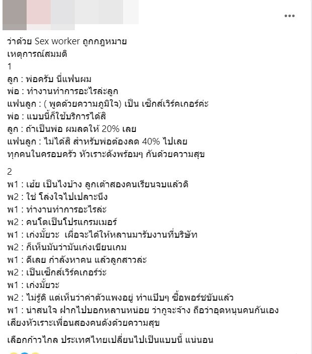 ถกสนั่น ผลักดัน Sex Worker เป็นอาชีพ ผ่านบทสมมติ ชาวเน็ตท่านหนึ่ง ยกเพื่อนพ่อขอจ้างทำงาน ในวันที่กฎหมายตีตรา ตีค่า การเมืองเปลี่ยน หันมาเหลียวแล
