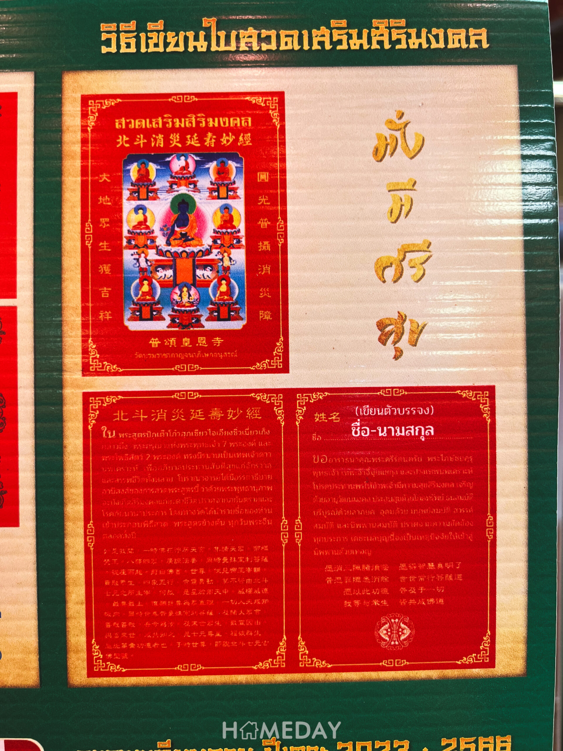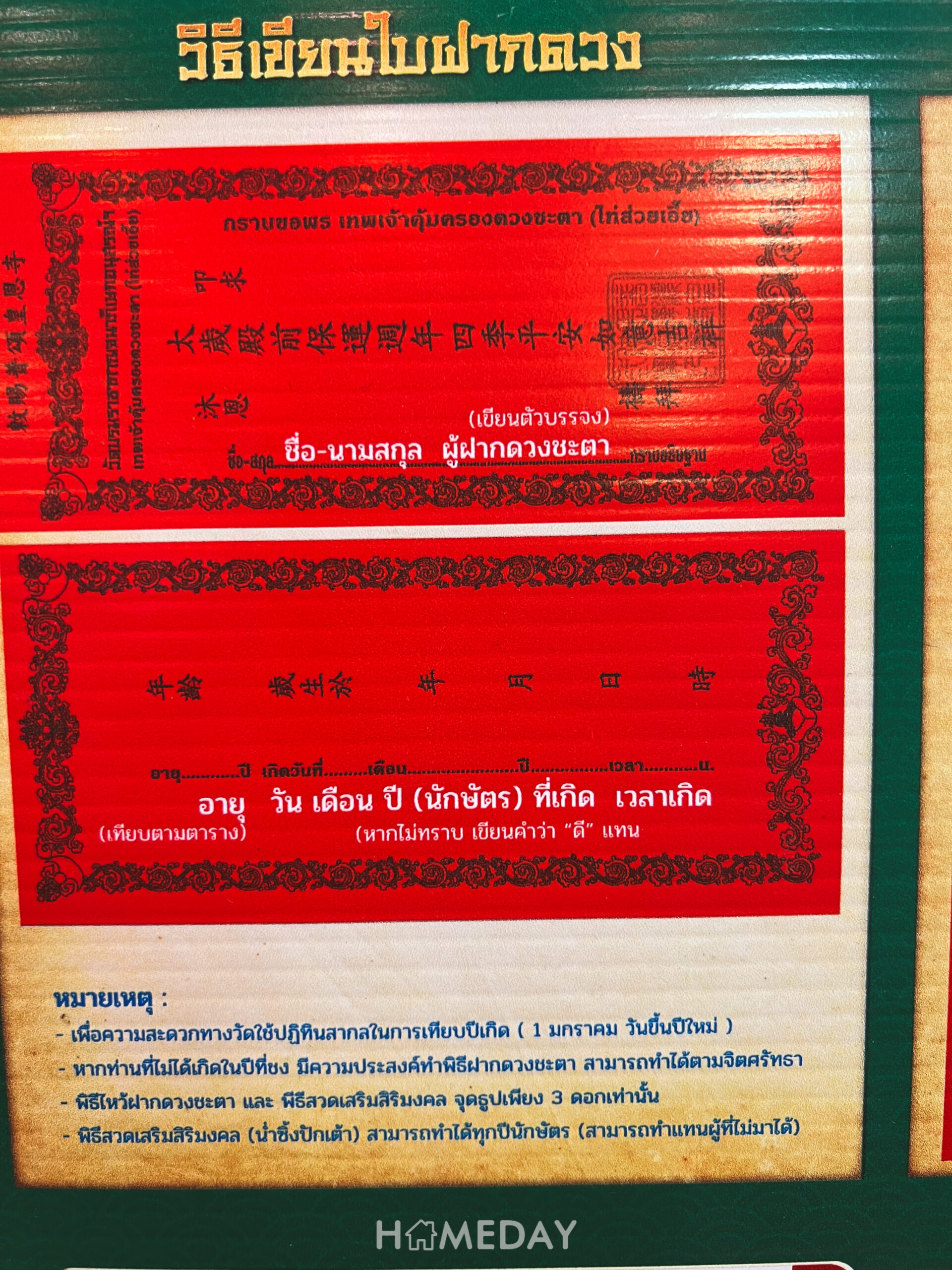 - เขียนชื่อ นามสกุล อายุ วัน เดือน ปีเกิด และเวลาตกฟากลงในใบเทียบฝากดวงสีแดง (หากไม่ทราบ เขียนคำว่า “ดี”)