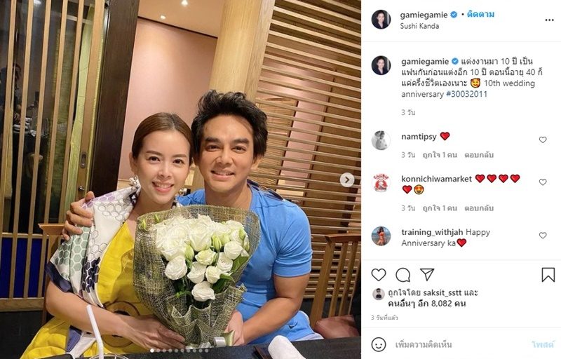 “แต่งงานมา 10 ปี เป็นแฟนกันก่อนแต่งอีก 10 ปี ตอนนี้อายุ 40 ก็แค่ครึ่งชีวิตเองเนาะ 10th wedding anniversary #30032011” โดยมีคนในวงการและแฟนคลับเข้ามาคอมเมนต์ยินดีพร้อมทั้งเชียร์ให้มีลูกอีกคนด้วย “ยาวนานมากแม่ มีลูก 2 คนคงไม่พอละล่ะ” , “เป็นคู่ที่น่ารักมากกกๆพี่” , “20ปี ยังหวาน น่ารักมากกกคะ” เป็นต้น